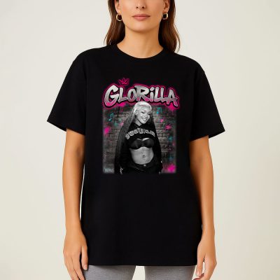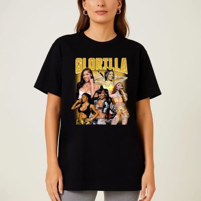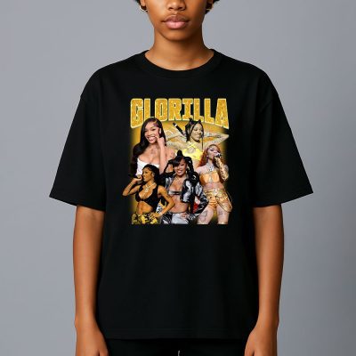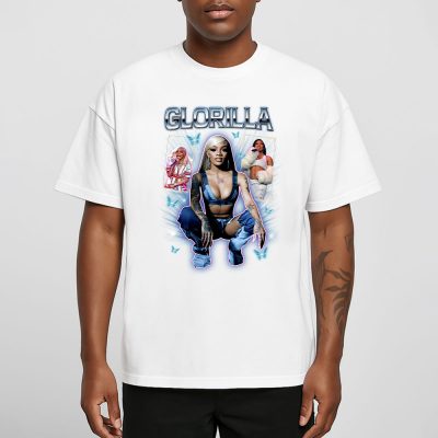 This white T-shirt showcases a vibrant “GLORILLA” design in gold, featuring multiple stylized images of the rapper GloRilla in dynamic poses, blending hip-hop flair with bold colors. It’s perfect for fans and streetwear enthusiasts.
