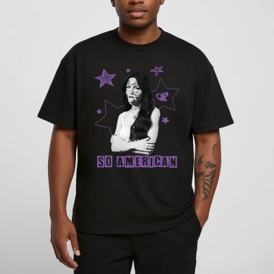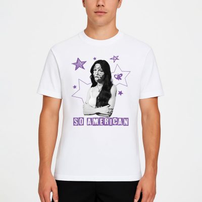 This T-shirt celebrates Olivia Rodrigo with a bold design, featuring her striking pose with arms crossed, adorned with a unique face pattern. Surrounded by playful purple stars, her initials “OR” add a personal touch, while “SO AMERICAN” text nods to her hit song, blending her edgy style with fan appeal.
