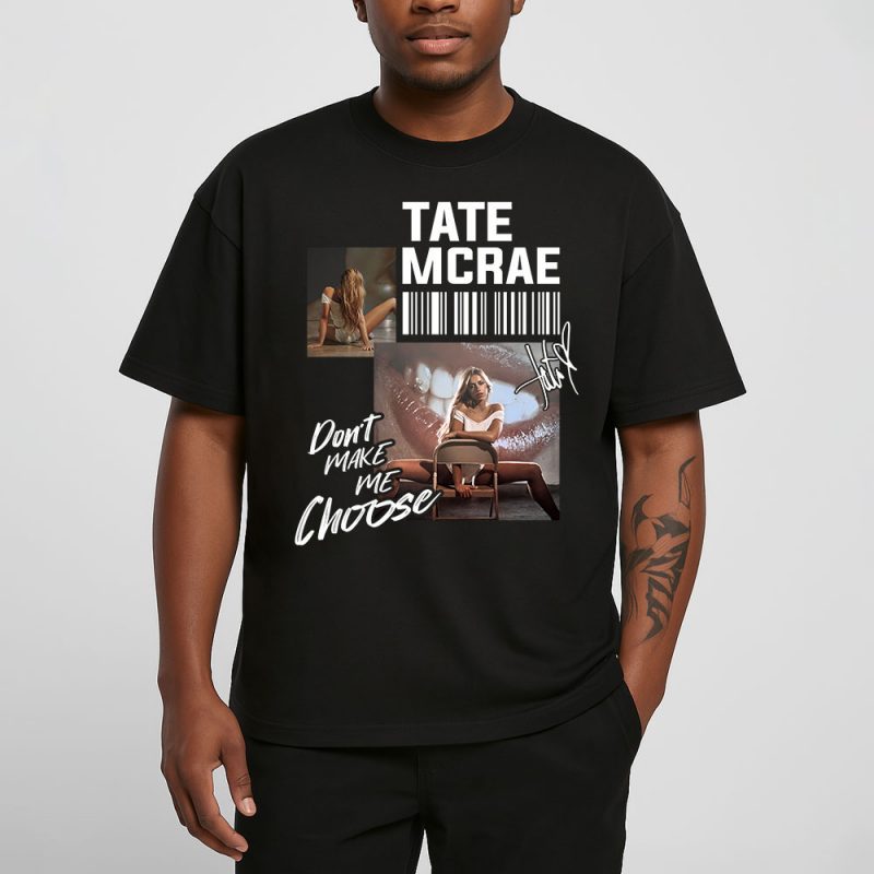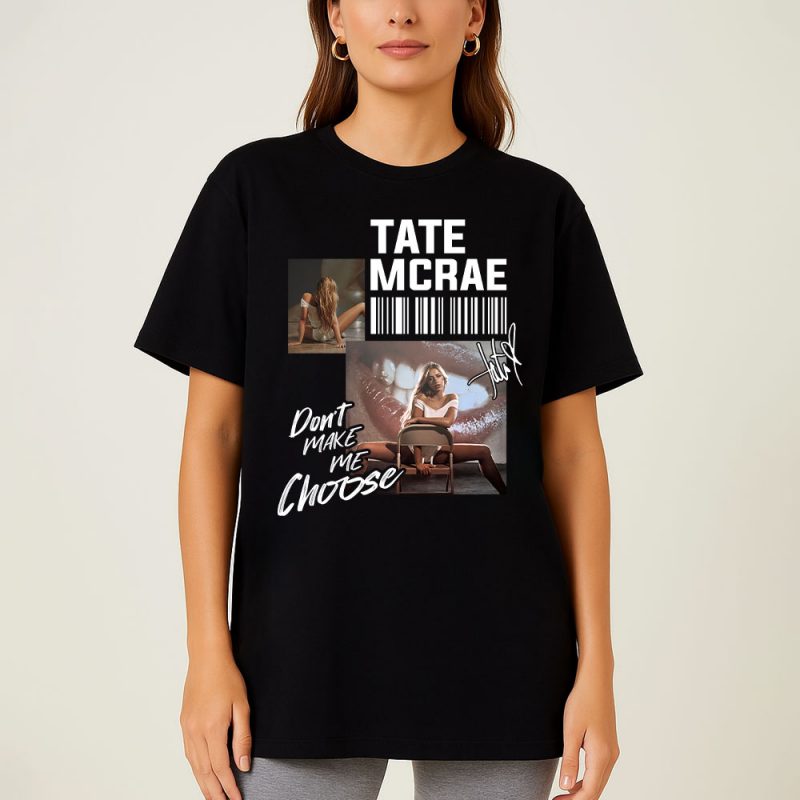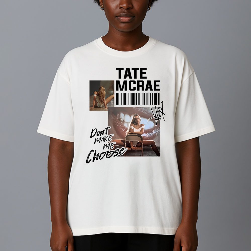 This T-shirt features Tate McRae with a captivating design, showcasing her in a striking pose on a chair, paired with a barcode-style “TATE MCRAE” text and her signature. The phrase “DON’T MAKE ME CHOOSE” adds a bold, personal flair.