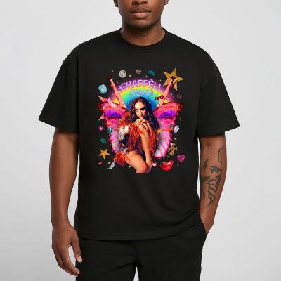 This T-shirt celebrates Chappell Roan with a vibrant design, featuring her in a glamorous pose with a flowing pink dress, embodying her pop-diva charm. The bold “CHAPPELL ROAN” text and a starry backdrop add a dazzling, theatrical flair.
