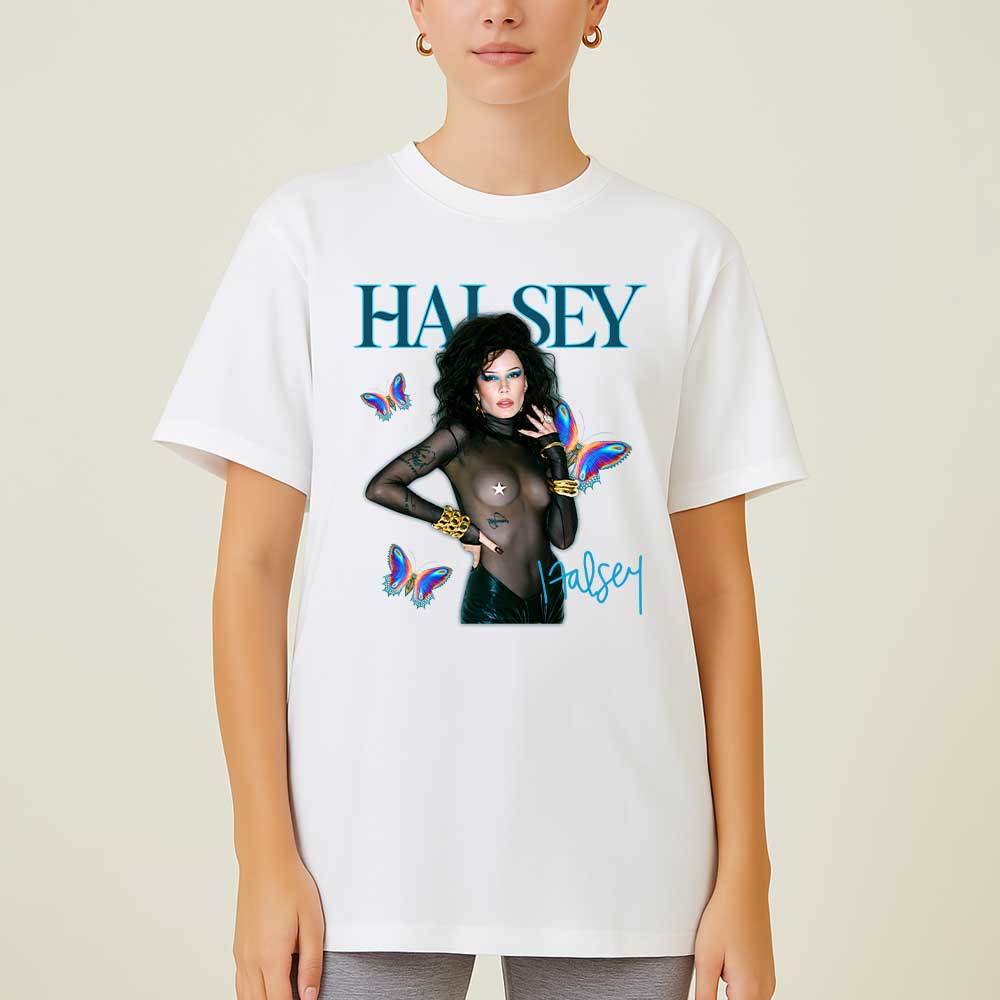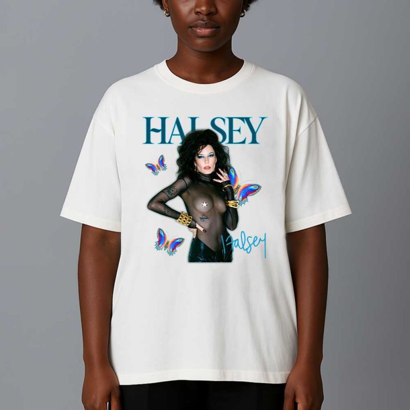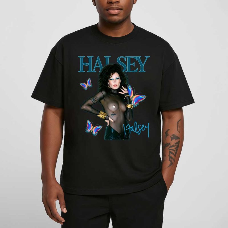 This T-shirt radiates Halsey’s bold charm with “Halsey” in fiery orange and a captivating shot of her with a mic—perfect for fans to showcase their devotion!