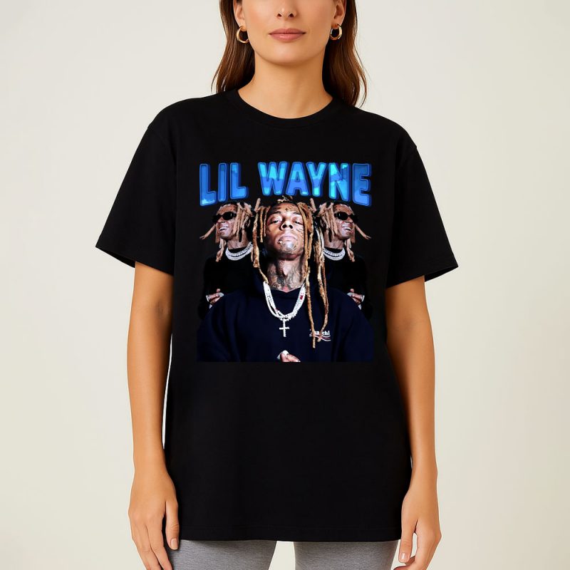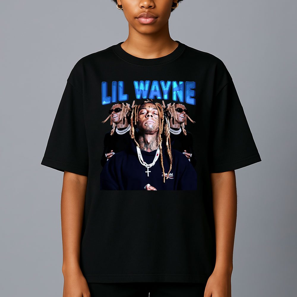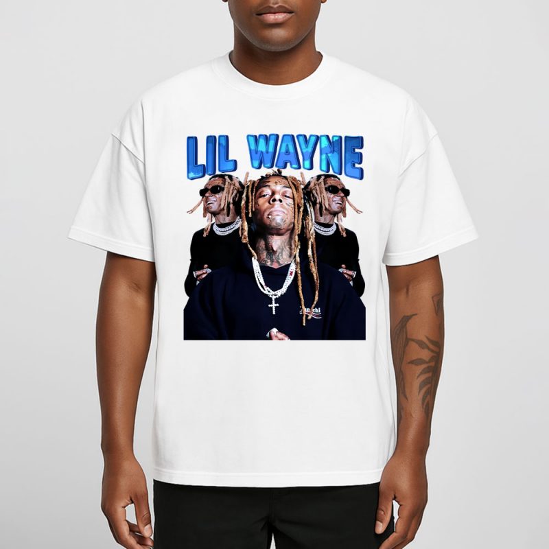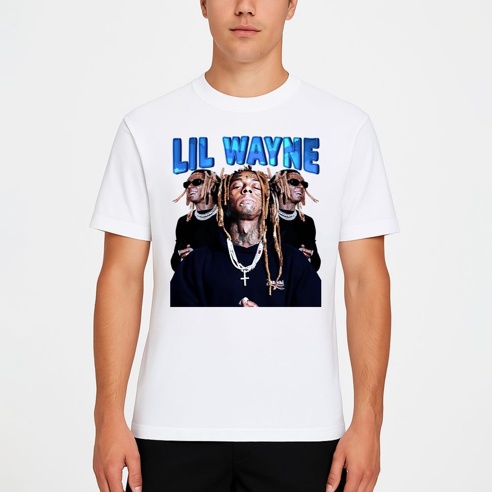 This T-shirt screams Lil Wayne with his iconic “Lil Wayne” name in flashy blue, showcasing multiple dope shots of the legend rocking chains and shades—perfect for any true fan to flex!