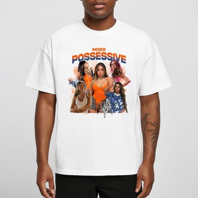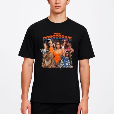This T-shirt celebrates Tate McRae’s “MISS POSSESSIVE” tour with a vibrant collage of her in various striking outfits, from an orange dress to a starry top. The bold text and her signature add a dynamic, fan-favorite touch.
