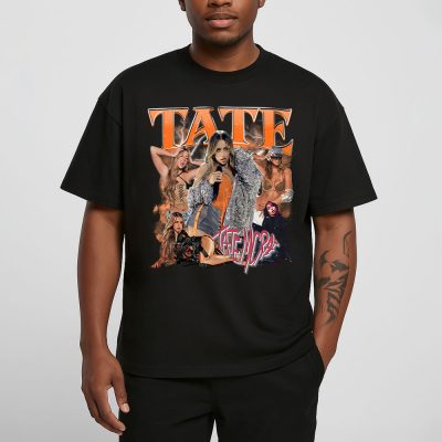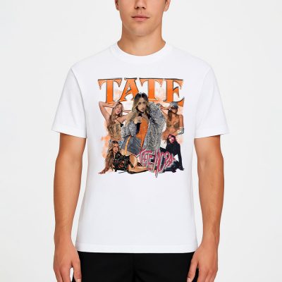 This T-shirt highlights Tate McRae with a vibrant collage of her dynamic poses, blending bold orange “TATE” text with her name in edgy red script. The fiery background and stylish outfits reflect her fierce pop persona.