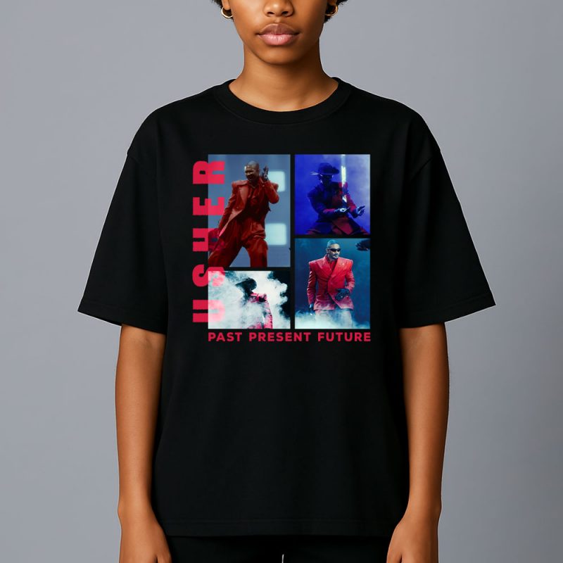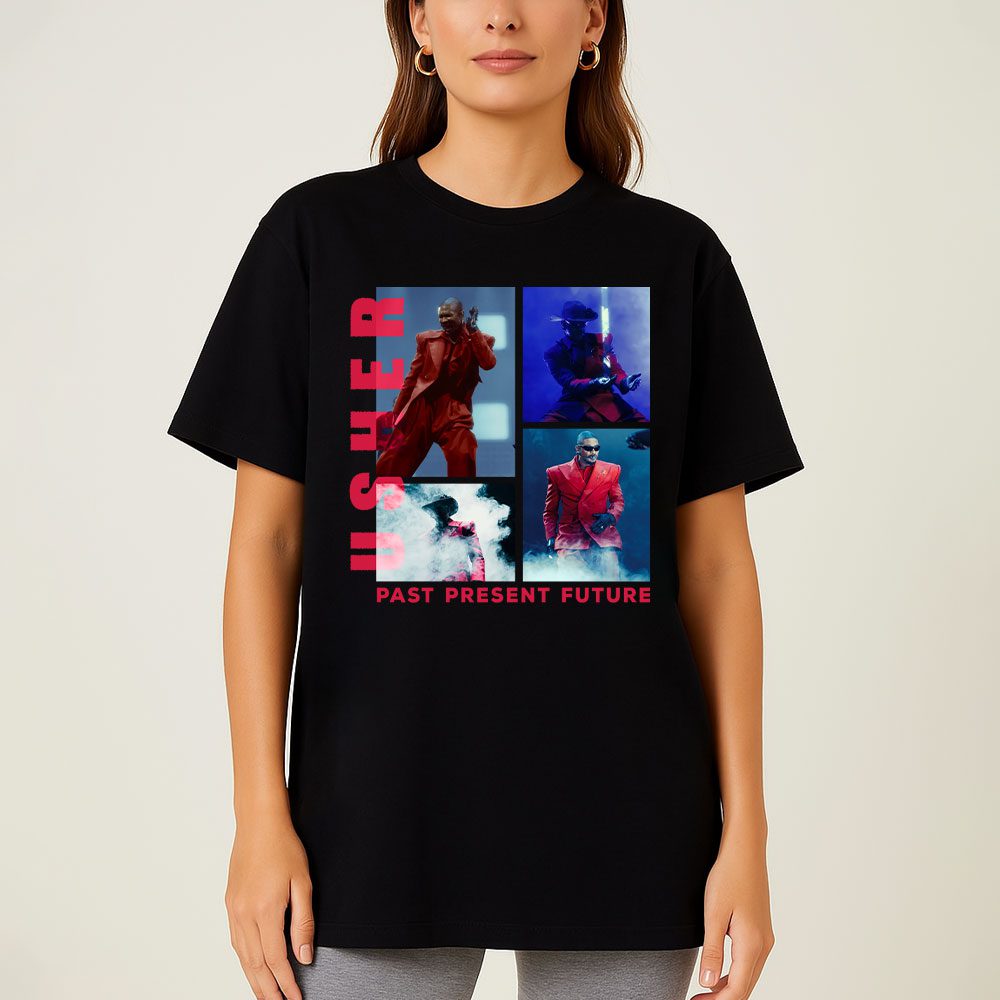 This T-shirt highlights Usher’s journey with “Usher” and “Past Present Future” in bold red, featuring dynamic performance shots in red and blue hues—perfect for fans!