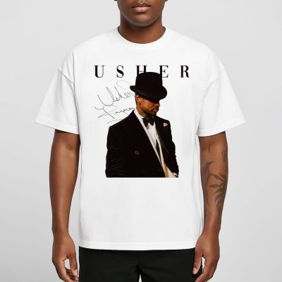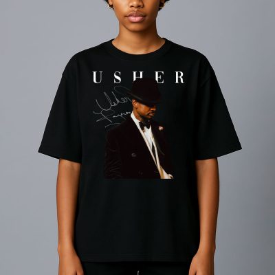 This T-shirt features Usher in a sharp suit and hat with his name “Usher” above and a signature flourishโideal for fans of his timeless style!