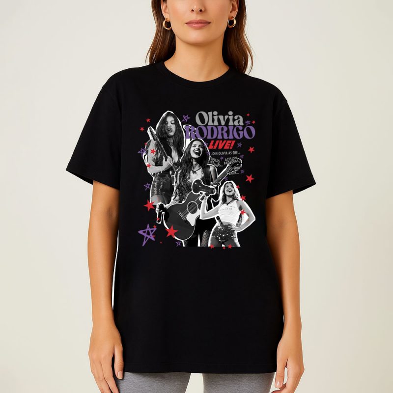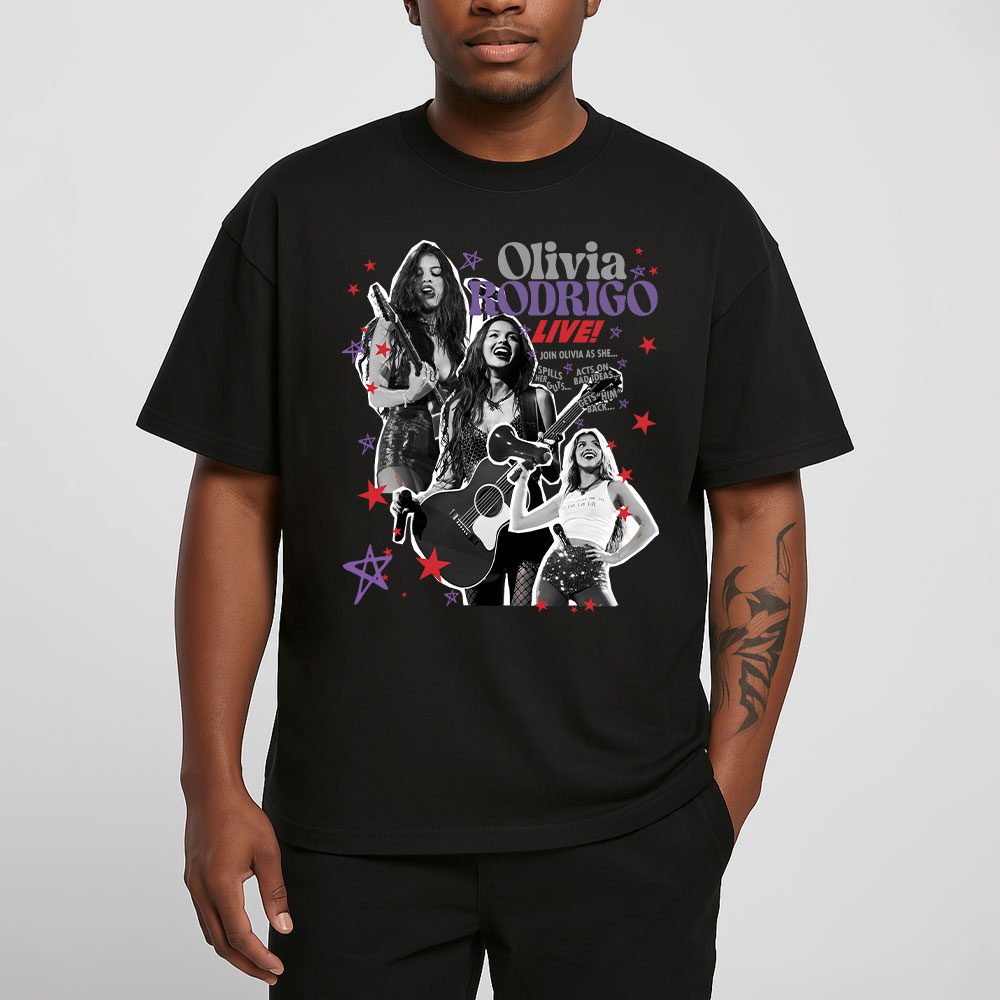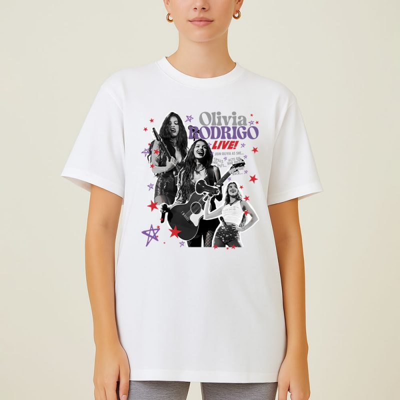 This T-shirt celebrates Olivia Rodrigo’s live energy with a dynamic collage of her performing, guitar in hand, and striking poses. The bold “OLIVIA RODRIGO LIVE” text, paired with vibrant stars and lyrics, captures her electrifying stage presence.