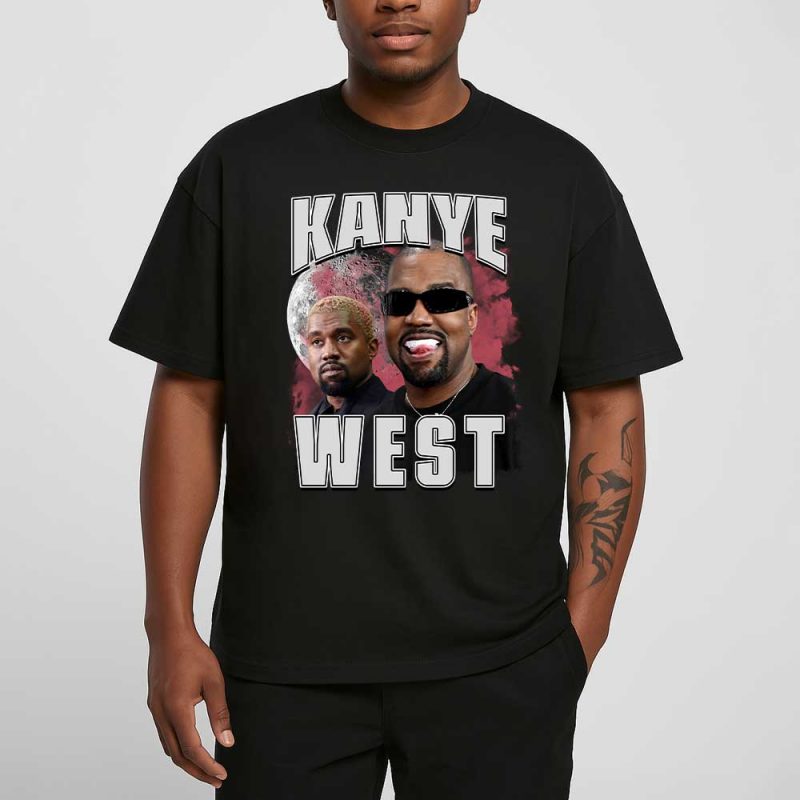 This T-shirt highlights Kanye West with “Kanye West” in bold white, featuring vibrant images of the artist against a smoky backdrop—ideal for dedicated fans!