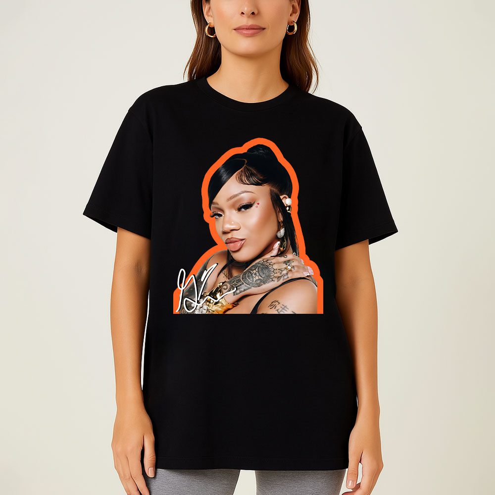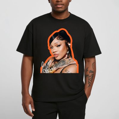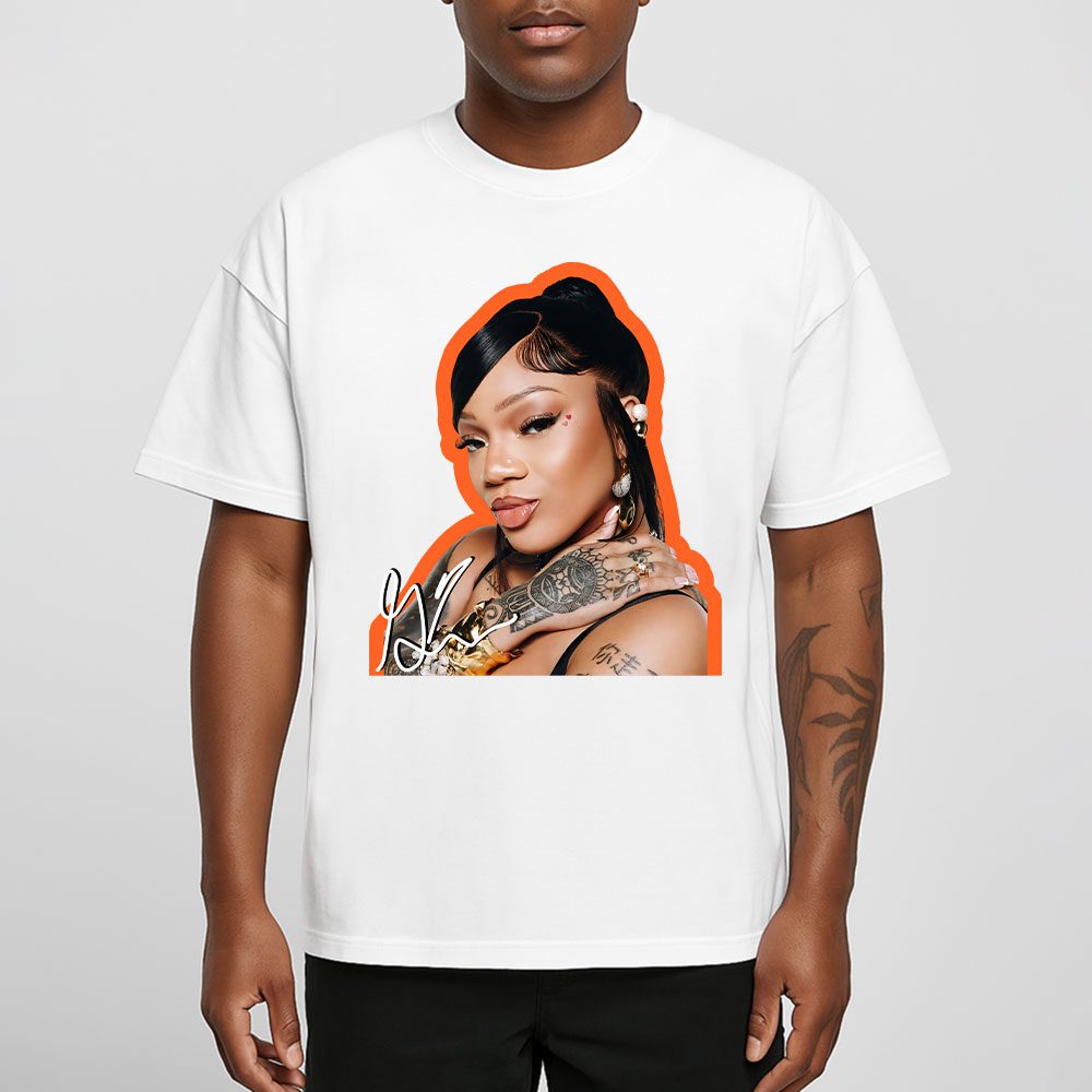 This white T-shirt features a striking portrait of GloRilla with bold orange outlines, highlighting her tattoos and jewelry, paired with her signature. It’s a must-have for fans of her rap style.