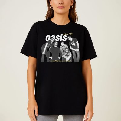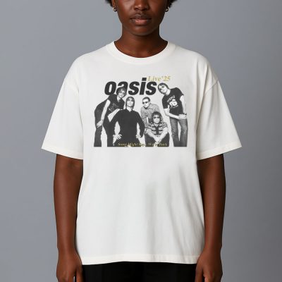 This T-shirt celebrates Oasis with a classic black-and-white group photo of the band members in their iconic poses, capturing their Britpop essence. The “oasis Live ’25” text and “Some Might Say, We’re Back” tagline highlight their much-anticipated reunion tour, blending nostalgia with rock energy.