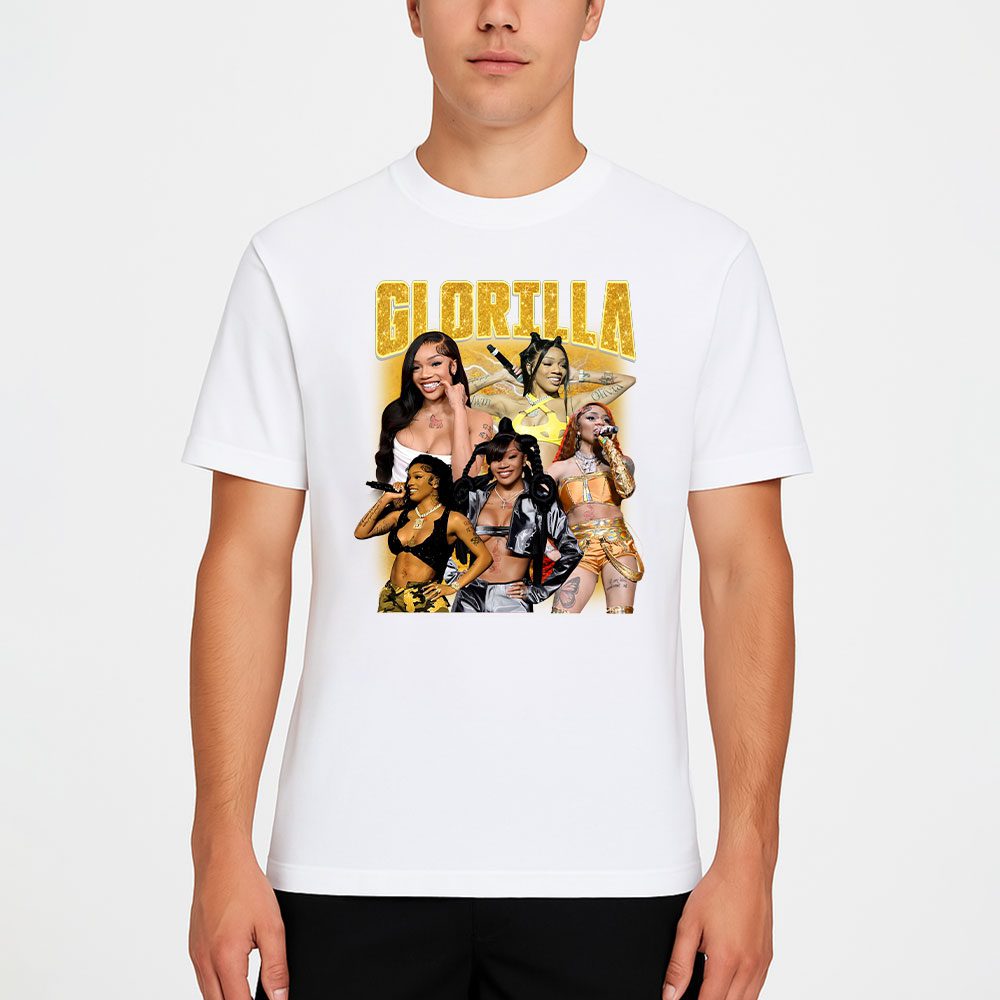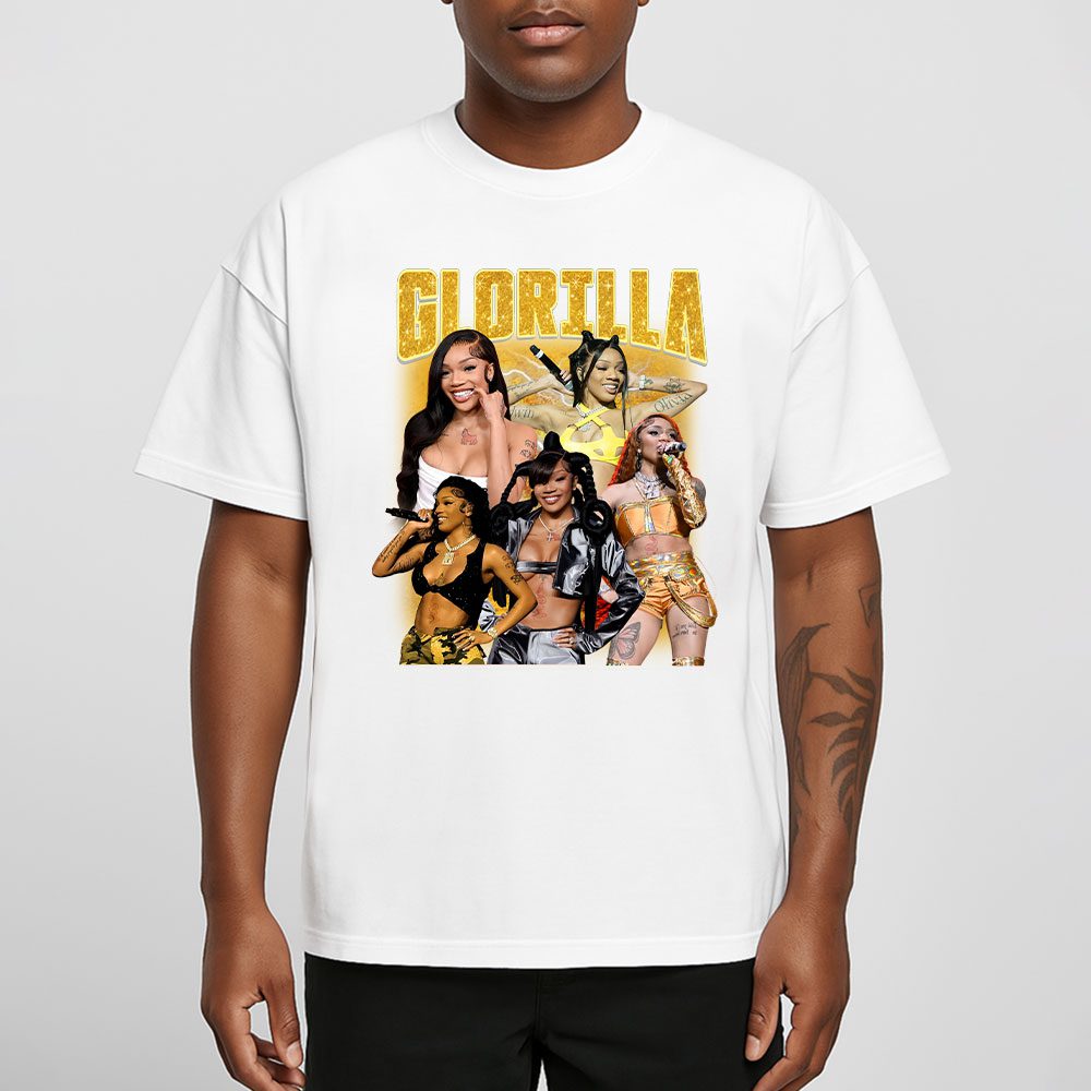 This white T-shirt showcases a vibrant “GLORILLA” design in gold, featuring multiple stylized images of the rapper GloRilla in dynamic poses, blending hip-hop flair with bold colors. It’s perfect for fans and streetwear enthusiasts.